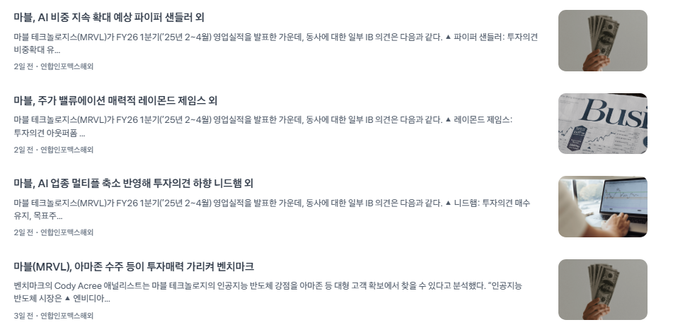 - 단기적 촉매제: 바로 이달(2025년 6월)로 예정된 마벨의 맞춤형 AI 칩 관련 웨비나는 회사의 기술력과 향후 로드맵을 구체적으로 확인할 수 있는 중요한 이벤트입니다. 이 웨비나에서 긍정적인 내용이 발표될 경우, 주가 반등의 강력한 촉매제가 될 것으로 기대됩니다.