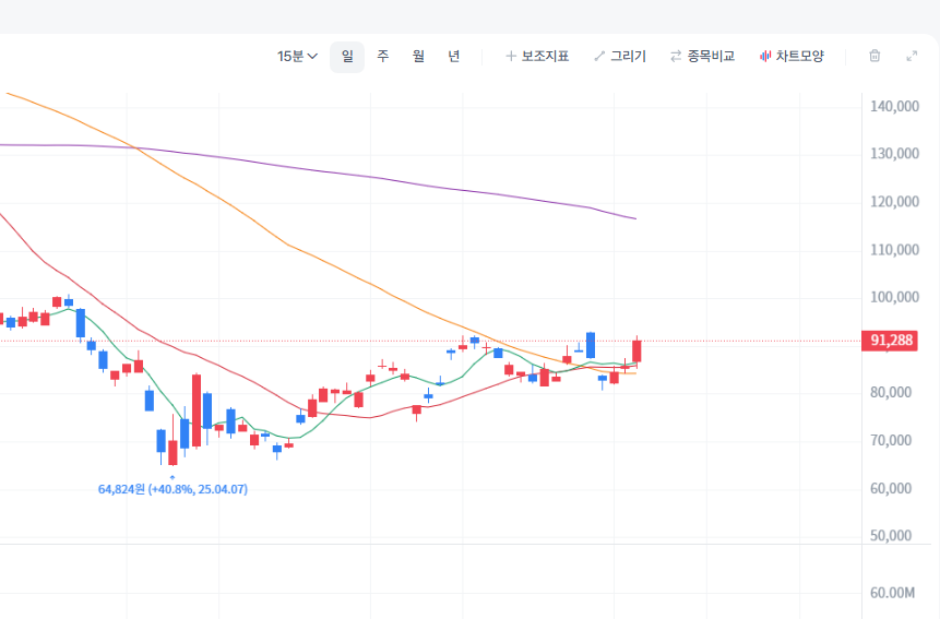 - 지지 및 저항선: 최근 형성된 저점(예: 50달러 후반 ~ 60달러 초반, 실제 차트 확인 필요)이 중요한 지지선으로 작용할 수 있습니다. 반등 시 1차 저항선은 이전 주요 매물대 또는 하락 과정에서의 주요 지지선이었던 [실제 차트 확인 필요] 달러, 2차 저항선은 달러 수준으로 예상해 볼 수 있습니다.