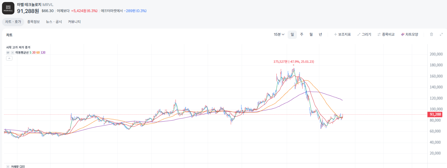 - 향후 전망: 마벨 테크놀로지는 AI 및 데이터센터 시장 성장의 핵심 수혜주로 평가받고 있습니다. 맞춤형 AI 반도체(Custom ASIC)의 수요 증가는 마벨의 지속적인 성장을 견인할 것입니다. 연초 이후의 주가 조정은 오히려 장기 투자자들에게 매력적인 진입 기회를 제공할 수 있다는 시각이 우세합니다. 다가오는 AI 칩 웨비나와 지속적인 실적 성장이 확인된다면 주가는 점진적으로 회복하며 애널리스트들의 목표 주가에 수렴해 나갈 가능성이 높습니다. 다만, 글로벌 매크로 경제 상황의 불확실성, 반도체 업황의 변동성, 그리고 미·중 기술 갈등과 같은 지정학적 리스크는 항상 유의해야 할 변수입니다.