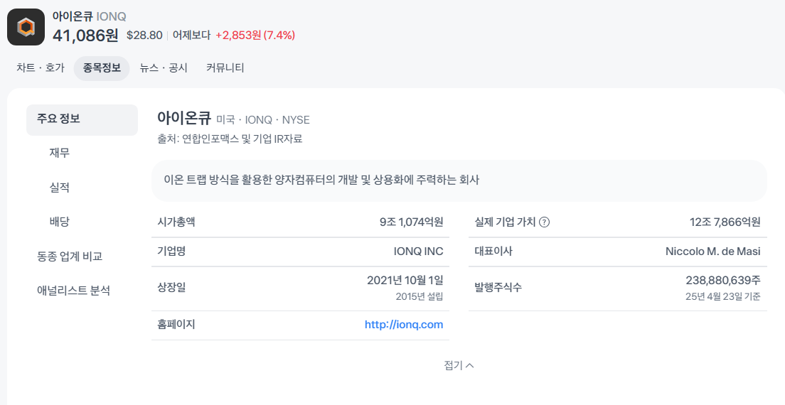 아이온큐(IONQ)는 2021년 SPAC 상장 후 변동성이 큰 주가 흐름을 보였습니다. Investing.com 2025년 4월 23일 기준 주가는 29.50달러(시가총액 약 62억 달러)로, 최근 1년 수익률은 +620%에 달하지만, 2024년 10월 고점(49.59달러) 대비 40% 하락했습니다.