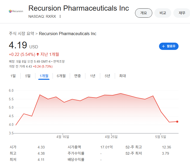 대표적인 바이오주인 리커젼 파마슈티컬스(RXRX)와 앰젠(AMGN)의 주가를 분석해 보자.