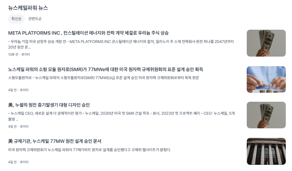 • 미국 내 신규 프로젝트 가능성: 과거 UAMPS와의 CFPP(Carbon Free Power Project) 계약 해지 이후, 뉴스케일 파워는 새로운 잠재 고객 확보에 주력하고 있습니다. 최근 미국 데이터센터 업체 및 대규모 산업 단지에서 안정적인 전력 공급원으로서 SMR에 대한 관심이 높아지고 있어, 신규 공급 계약 체결 여부가 중요한 모멘텀이 될 수 있습니다. (가상 시나리오, 실제 뉴스 확인 필요)