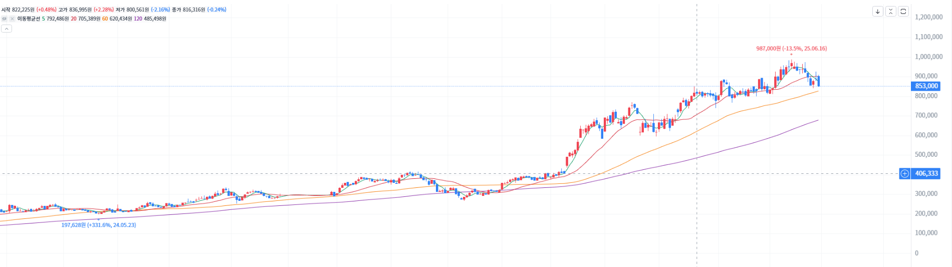 - 830,000원: 강한 지지선, 추가 하락 시 단계적 매수 전략 유효