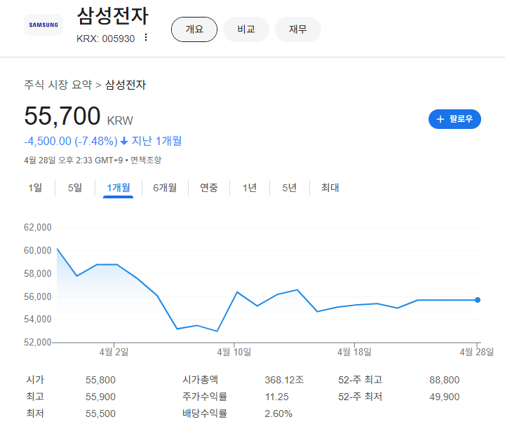 - 주가: 75,000 KRW (-0.53%, 4월 28일 14:47 KST).