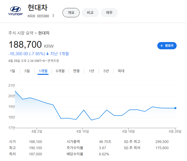 - 주가: 192,000 KRW (+1.05%, 4월 28일 14:47 KST).