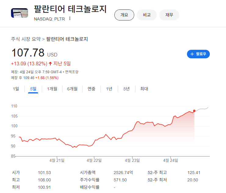2025년 4월 24일, PLTR 주가는 105.45달러(시가총액 2,186억 달러)로, 3거래일 15% 상승했습니다. 1년간 345%(+620% YoY), YTD 40% 상승했으나, 2월 고점(124.62달러) 대비 15.3% 낮습니다.