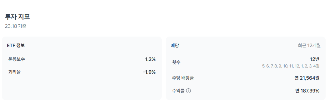 • 고배당 매력: 연 87.12% 배당률, 월 0.5989 USD로 현금흐름 안정.