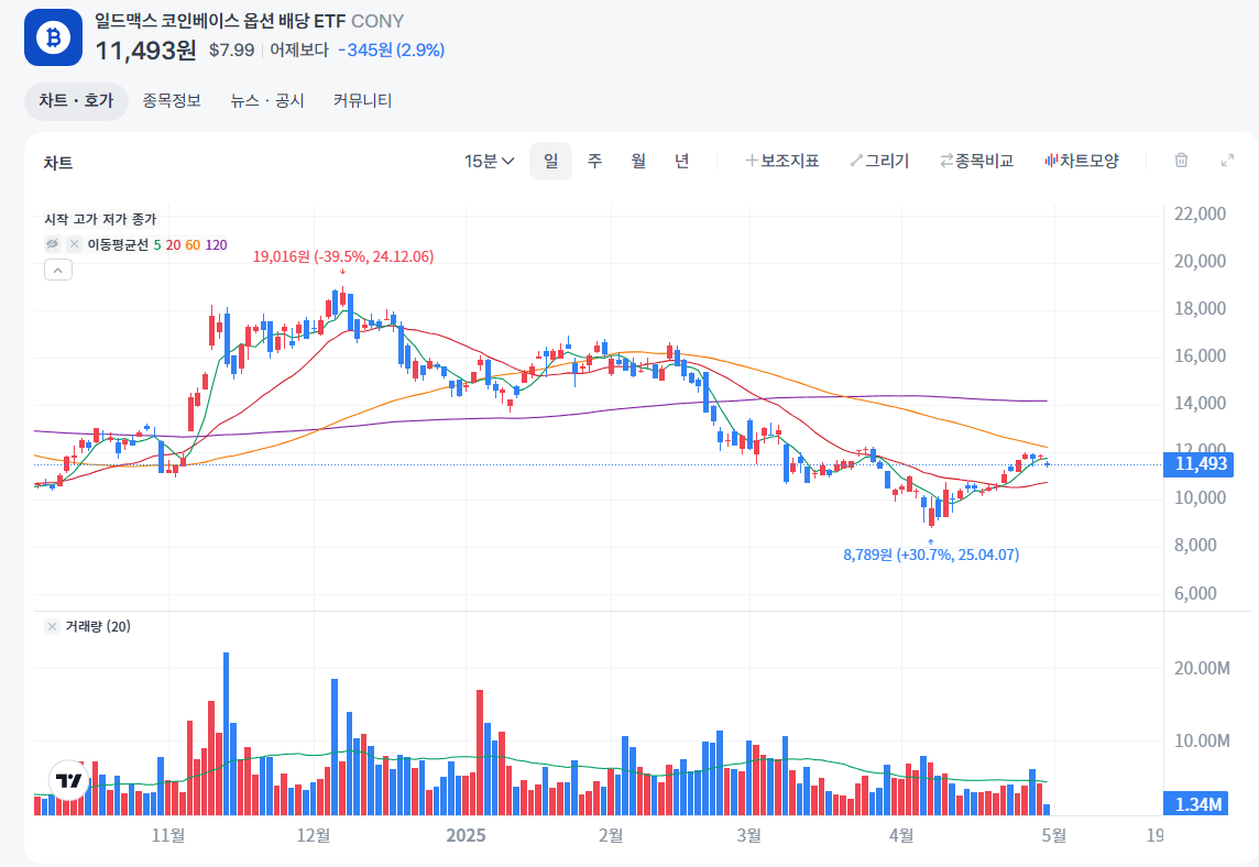 • 배경: CONY는 코인베이스(COIN) 주식의 커버드콜 옵션을 판매, 비트코인 가격에 간접 연동. 2025년 비트코인 20% 하락(3월 고점 대비)으로 COIN 주가 15% 조정, CONY 주가 11.75 USD(-3.29%).