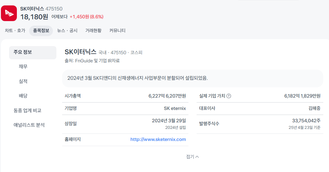 SK이터닉스는 2024년 3월 SK디앤디의 신재생에너지 사업부문이 인적분할되어 설립된 기업입니다.