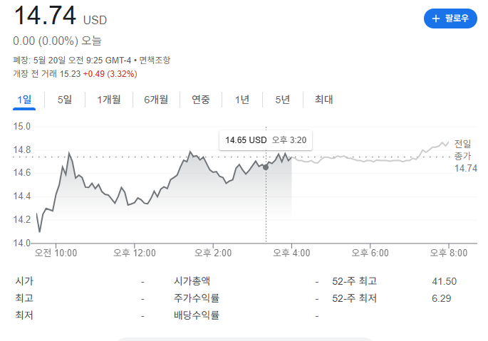 주가는 5월 중순 중국 시장 호조로 급등했으나 무디스 발표 이후 소폭 하락했습니다 52주 최고가는 41.50달러 최저가는 6.29달러로 변동성이 매우 큽니다 저는 현재 보유 중인 주식이 약세를 보이고 있지만 단기 회복 가능성을 기대하고 있습니다