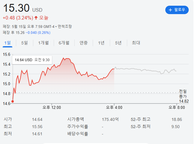 - 이동평균: 50일 이동평균선($14.50) 위로 거래 중이며, 단기 상승 모멘텀 유지.