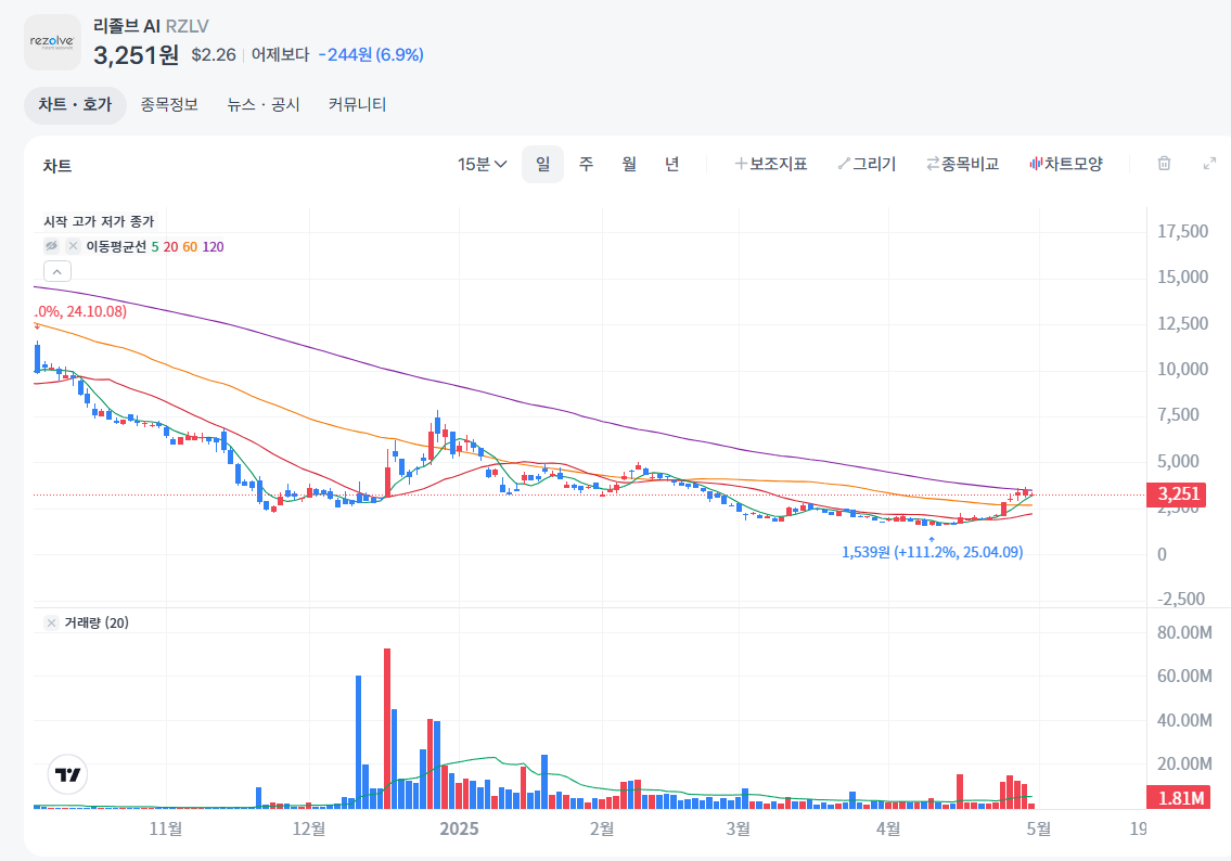 RZLV 주가는 상장 후 급등(27 USD)했으나, 관세전쟁과 재무 우려로 4월 30일 10.80 USD(-2.70%)로 하락했습니다. 그러나 RSI 42와 저평가 논의로 반등 가능성이 제기됩니다.