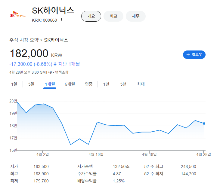 SK하이닉스는 HBM(고대역폭 메모리)과 AI 메모리 수요 증가로 2024년 역대 최고 실적(매출 66.2조 원)을 기록했으며, 2025년에도 상승세를 이어갑니다. 2025년 4월 28일 17:56 KST 기준 주가는 192,000 KRW(+1.05%)입니다.