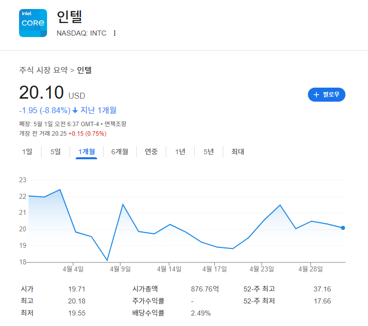 인텔 주가는 2024년 60% 하락하며 21달러 수준(2025년 5월 1일 기준)으로, S&P 500 대비 부진합니다. 그러나 밸류에이션은 저평가 신호를 보입니다.