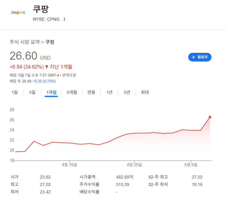 2025년 5월 6일 기준, 쿠팡 주가는 $26.50으로 자사주 매입 발표 이후 상승세를 보이고 있다.