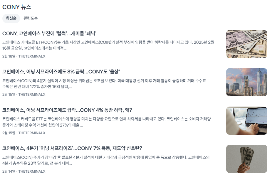 - 리스크 요인: COIN 주가 의존도, 암호화폐 시장의 규제 불확실성, 비분산 투자 구조. YieldMax ETFs는 CONY가 COIN의 하방 리스크에 직접 노출된다고 명시.