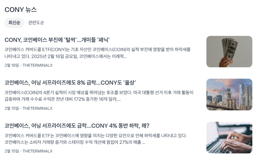 - 배경: 2025년 트럼프 행정부의 암호화폐 규제 완화 기대감(ETF 승인) 상존, 그러나 SEC의 거래소 규제 강화 우려. COIN의 규제 리스크가 CONY에 전이.