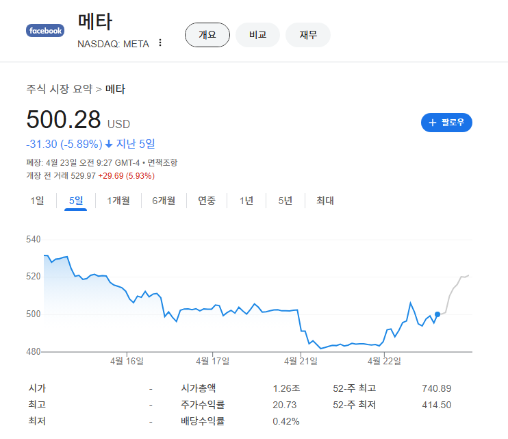 메타 주가($META)는 2025년 4월 23일 기준 493.50달러로, 과징금 발표 후 2~3% 하락했습니다。메타는 광고 중심 사업 구조상 EU 규제에 민감하므로, 중기적으로 주가 변동성이 애플보다 클 수 있습니다.투자자는 광고 모델 수정 결과와 EU 사용자 반응을 주시해야 합니다.