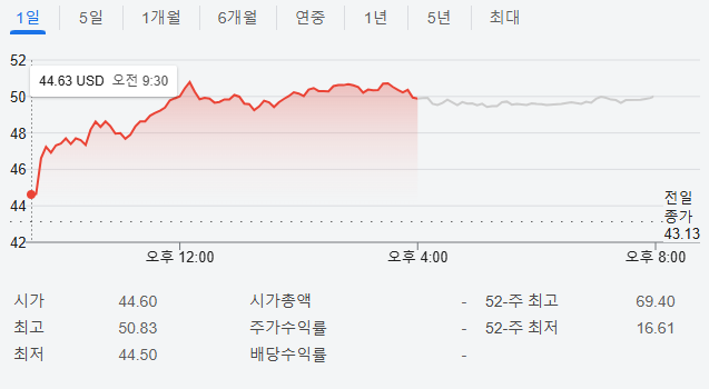 | 2025년 5월 6일 | 41.85 | -24.36% (5월 5일 대비) | 실적 후 하락 |